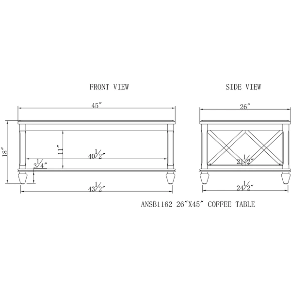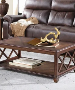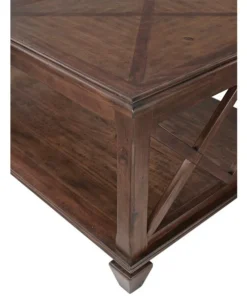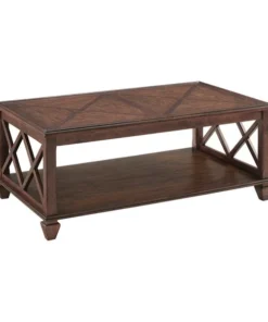 This classic collection is rich in character. The open side panels give a relaxed feel to these timeless pieces. Made of pine wood and finished in a distressed cherry stain that brings warmth to your living space. This gorgeous coffee table with shelf will be a perfect accent next to your sofa