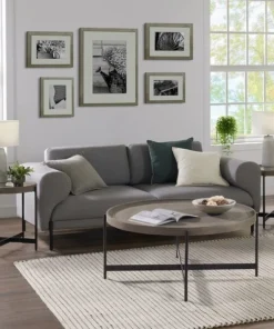 The simplistic design is both chic and functional. The mix of materials give this collection a rustic industrial feel that is sure bring character to your living space. Features solid wood tray tops that are fixed in place on a metal base. This round coffee table provides an ideal spot to place your books, magazines, beverage or snacks while entertaining in the living room. The end tables beautifully marry form and function and fit perfectly in a living room, family room, or office area without crowding a space or sacrificing style.