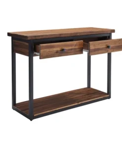 This collection of rustic wood and metal provides unpolished elegance to your space. With functional drawers and a low shelf each piece is uniquely yours. Knots, cracks and even rough-hewn edges showcase the wood's original qualities. Our lacquer finish with light and dark tones allows for the wood's natural grain to show through. This collection will make a statement in your living space.