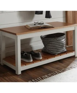 Savannah collection offers modern cottage styling; with its wood top and white painted legs it offers fresh style to your living space. Savannah includes end tables, console tables and media/storage pieces. You can design the perfect living room for your home. This 40" wide bench features a lower shelf for additional storage or display space. The pine construction makes this piece sturdy and durable.