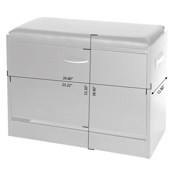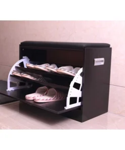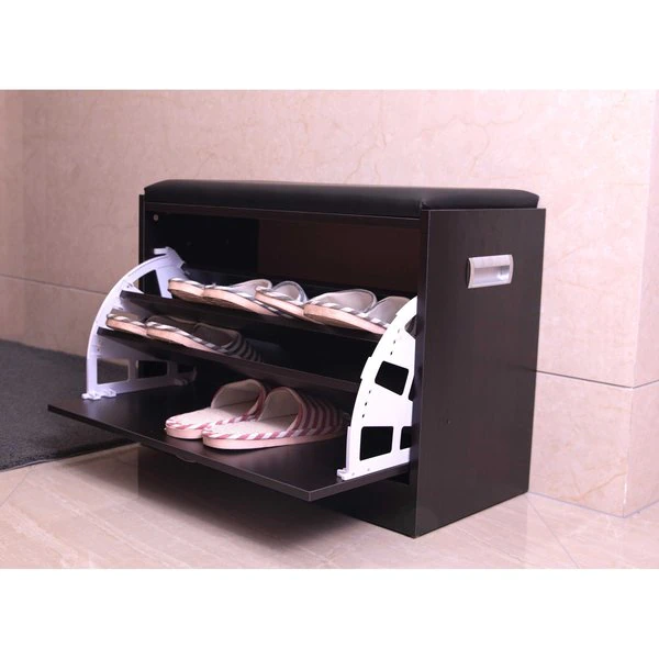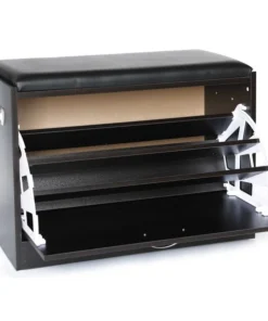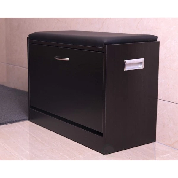 Organize your shoe collection with the Basicwise Black Wooden Fold-out Shoe Organizer. Designed with a hidden fold out rack, it provides storage for up to nine pairs of adult shoes. The shoe racks neatly fold closes, leaving only a sleek drawer exterior for display. Its padded leather top serves as a comfy stool for when you need a seat.