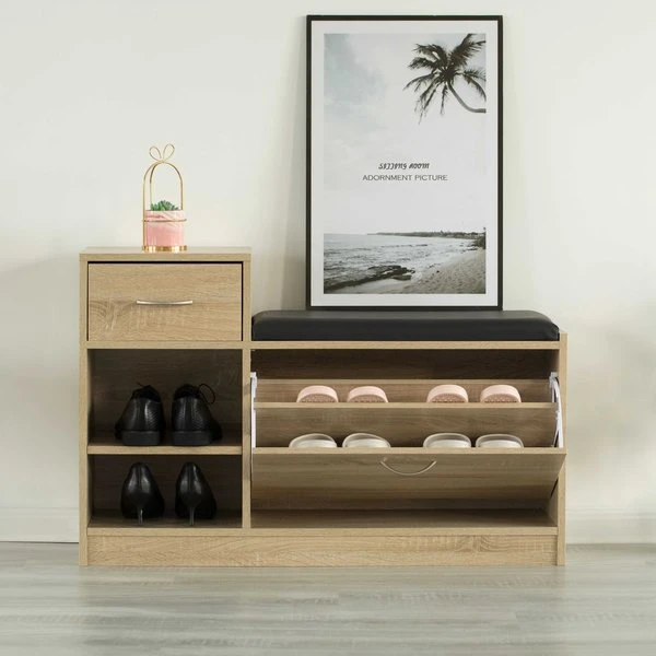 Organize your shoe collection with this shoe bench organizer. Designed with a hidden fold out rack, it provides storage for up to nine pairs of adult shoes. Additionally, the storage bench has 2 side open compartments and a drawer for extra storage. The shoe racks neatly fold closes, leaving only a sleek drawer exterior for display. Features various size compartments, useful for storing both shoes and boots. Its padded leather top serves as a comfy stool for when you need a seat. Welcome home.