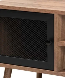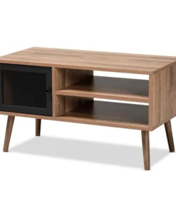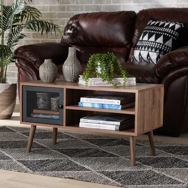 Rethink the layout of your living room with the bold design of the Yuna coffee table. Made in China, this stunning piece is comprised of a sturdy wood frame embellished with solid metal. One shelf behind the door provides a secure storage area, while two open shelves create a lovely display space. Requiring assembly, the Yuna features a mesh metal door for a cool, industrial touch. Angled legs complete the classic silhouette, making the Yuna coffee table an expressive addition to any space.