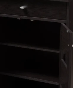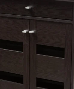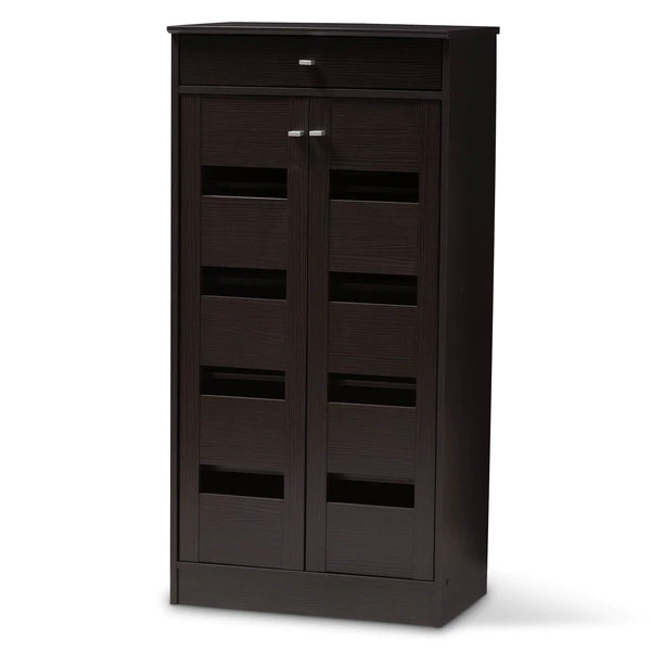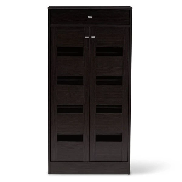 Keep your space tidy and stylish with the Acadia shoe cabinet. The modern and contemporary-inspired design is exemplified in this cabinet's straight, clean lines and tall silhouette. The Acadia is finished in a wenge brown with silver finished rectangular door handles. This tall shoe cabinet has one convenient top drawer that can serve as convenient place to put keys, mail, or serve as a catch-all drawer. The Acadia features five shelves discreetly placed behind two slatted doors, providing ventilation as a shoe rack and keeping clutter out of sight. This shoe cabinet provides plenty of storage space for shoes, purses, or anything else that needs tidying up to keep your entryway or mudroom organized. The Acadia requires assembly.