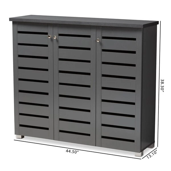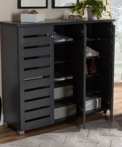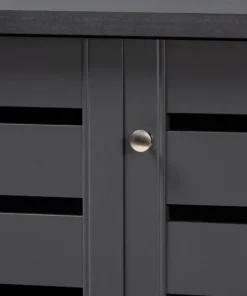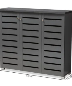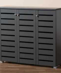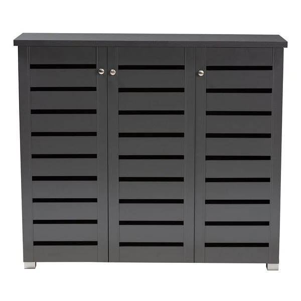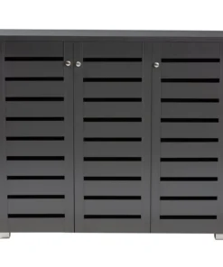 Shoe organization is made easy with the Adalwin cabinet. Featuring a stylish contemporary design and dark grey finish, the Adalwin is easy to coordinate with any style of decor. Three doors conceal eight fixed shelves with storage space for up to 20 pairs of shoes. The doors feature open slats to enable air circulation and prevent mold growth on your shoes. The Adalwin cabinet requires assembly.