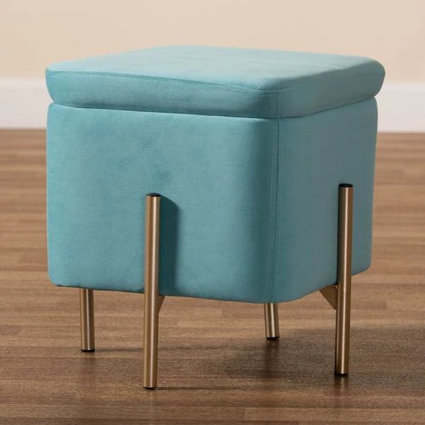 Baxton Studio Aleron Glam and Luxe Sky Blue Velvet Upholstered and Gold Finished Metal Storage Ottoman