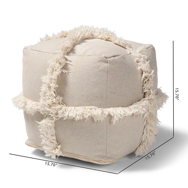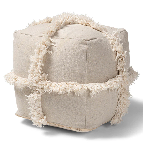 Add a cozy, bohemian touch to any space with the Alfro pouf. Handwoven from cotton, the Alfro features an understated beige hue. A criss-cross overlay of fringe lends a touch of texture. This versatile piece can be used as a seat, footstool, or casual coffee table.