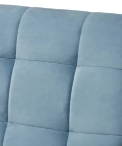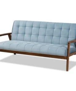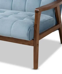 Declare your allegiance to timelessness with the Asta living room set. Constructed from solid rubberwood, the Asta set includes one sofa and two chairs. Each piece is upholstered a soft, sumptuous light blue velvet fabric that complements the walnut brown finish on the wood. Wide, plush cushions provide ample seating comfort, while biscuit tufting and angled legs lend a cool, retro look. Stylish and versatile, this set is well suited for both private living spaces and public reception areas. The Asta living room set requires assembly.