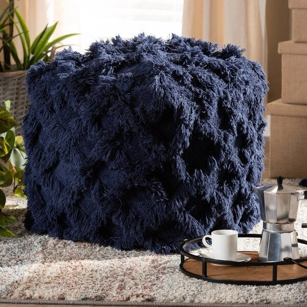 Add a cozy, bohemian touch to any space with the Asuka pouf. Handwoven from a soft, fleece-like cotton, the Asuka features a chic navy hue. A criss-cross overlay of fringe lends rich texture. This versatile piece can be used as a seat, footstool, or casual coffee table.