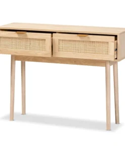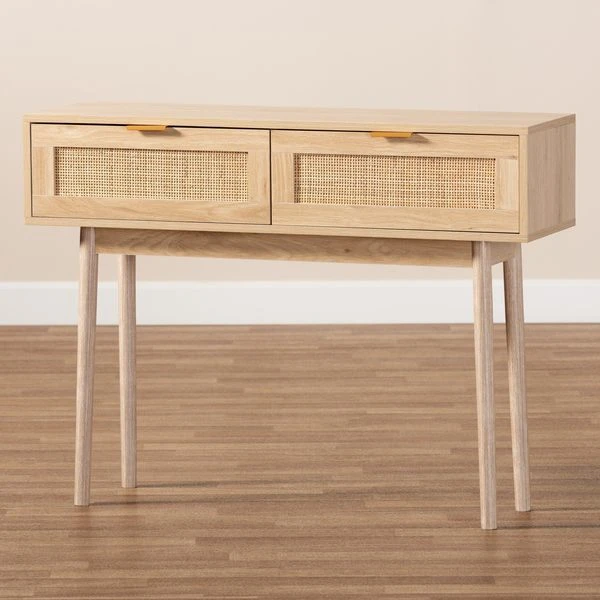 Add a retro inspired accent to your entryway with the stunning Baird console table. Made in China, the Baird is comprised of sturdy wood showcasing a light oak brown finish. Two drawers provide space to store keys and mail, while the wide tabletop offers room to display plants and decor. Requiring assembly, the console features woven rattan drawer faces and gold tone metal handles for eye catching style. A handy piece brimming with personality, the Baird console is sure to enhance any space.