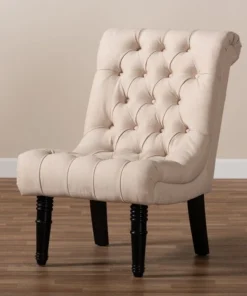 Showcasing a posh silhouette, the Barthe chair is sure to elevate the style of any living space. This dapper chair features a rolled back, providing both comfort and elegance. Striking attention to detail is evident in the button tufting on the seat and back, as well as the black ring turned legs. Constructed from sturdy eucalyptus wood, the Barthe is upholstered in a soft, durable linen polyester fabric. The Barthe chair will arrive fully assembled.