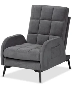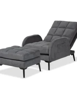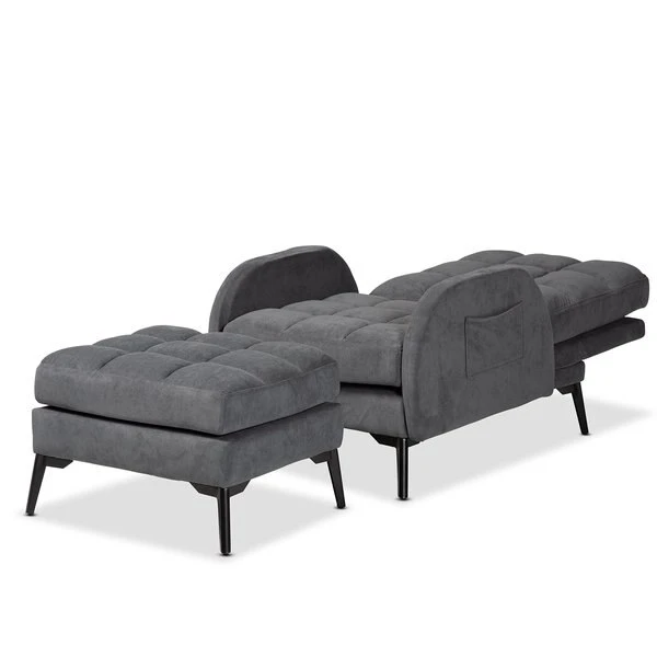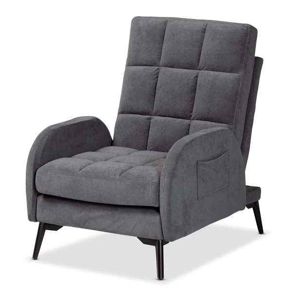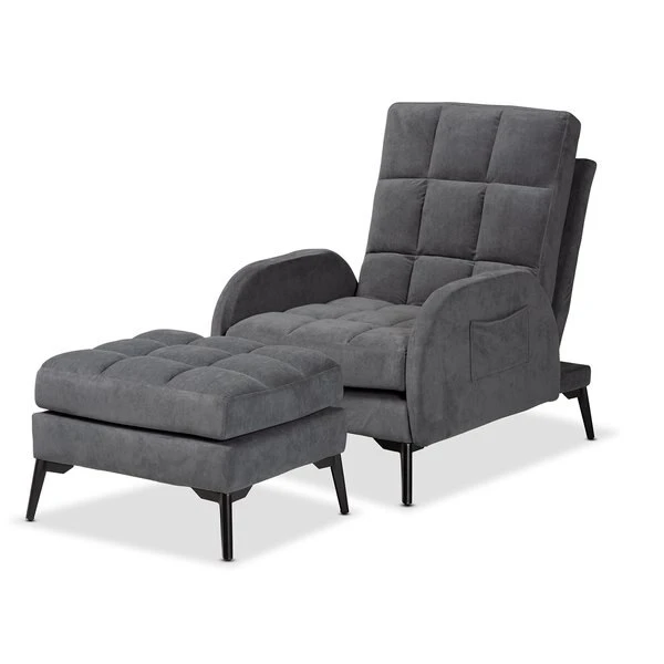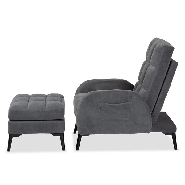Give your home a cozy spot to relax and unwind with the Belden lounge chair and ottoman set. Made in China, this set includes one recliner chair and one ottoman comprised of sturdy wood frames padded with foam and upholstered in luscious velvet fabric. The cushions feature grid-tufting to provide plush comfort while showcasing contemporary style. Requiring assembly, the Belden chair reclines 9 degrees and features a handy storage pocket on the side of the chair for remotes, books, and more. With a sleek, contemporary design, the Belden lounge chair and ottoman set is sure to look right at home in any private setting.