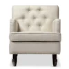 Contemporary rocking chair with modern design adds elegance and comfort into your residence. Bethany rocking chair can simply make a better relaxing space for you and your kids. Spending moment will be just interesting at high value of beauty and charm. Bethany rocking chair offers cushy armchair to become your reading nook or simple seating with sophistication and comfort. It has always been a popular addition for living room, that also interesting in featuring relaxing space in a bedroom. Featuring solid rubberwood in dark espresso brown matching with polyester fabric, the rocker is built to last. Button-tufting design and silver nail heads trim around the edges of the armrests and seat base add more charms to this piece. The Bethany looks smart, modern, but comfortable can be a good rocking chair for nursery during middle of the night feedings and yet a pretty piece of furniture to accent the room. The Bethany requires assembly.