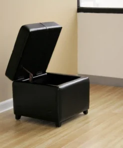 This small cube ottoman is the ultimate in versatility. The top consists of four leather panels, which are securely stitched together, forming a simple square pattern. Lift the lid to reveal ample space in which to store frequently used items, such as favorite books, remote controls, blankets, and more. Little hands and fingers will be protected by the additional safety hinge.