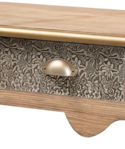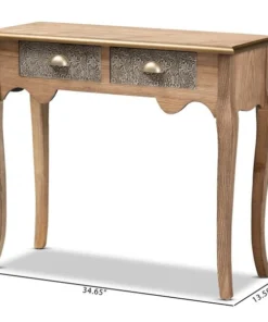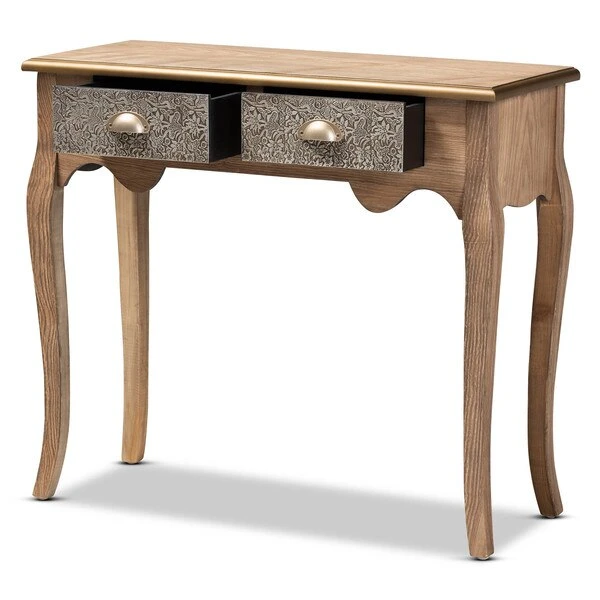 Keep your entryway or living room organized in the most charming way with the Clarice console table. Inspired by classic French furniture silhouettes, this wood table features long, elegant cabriole legs. Storage space is provided by two metal drawers, ideal for storing keys, chargers, and more. Striking attention to detail is displayed on the drawers, which are embossed with intricate floral motifs, as well as on the gold-finished edges of the tabletop. Its slim silhouette makes it well suited for placement in a hallway, entryway, or living room. The Clarice console table requires assembly.