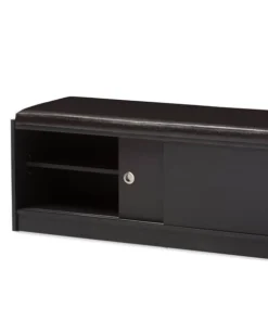 This entryway bench combines style and function and it'll effortlessly blend into any space and really help clear your space of those messy piles of shoes that everyone always trips over. This unique seating bench features two storage compartments behind the sliding doors and a faux leather cushion top for comfortable seating. This solid piece is constructed of engineered wood in dark brown PU veneer. To add more functionality, you can use the faux leather storage bench ottoman in the living room for a place to rest your feet as you watch TV or read a book. The interior can be used to hold magazines, newspapers, remotes or other electronic devices. This lovely piece can also be used as extra seating, when needed. The seating shoes storage bench requires assembly.