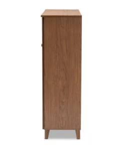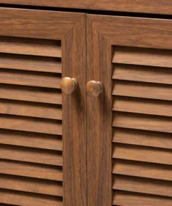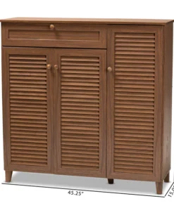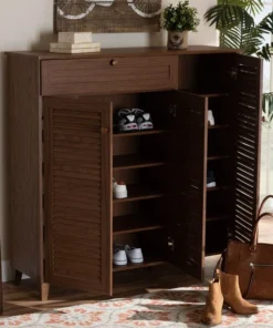 Store your shoes on the sly with the Coolidge shoe cabinet. Three slatted doors, fitted with round knobs, conceal 11 shelves with storage space for up to 21 pairs of shoes. One spacious drawer, accented with inset paneling, provides additional storage space for extra shoelaces and miscellaneous items. Tapered legs add refined style and provide elevation to deter dust buildup. Constructed from engineered wood, the Coolidge showcases a classic walnut brown finish that complements any color scheme. The Coolidge shoe cabinet requires assembly.