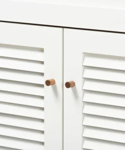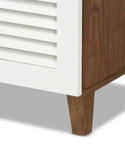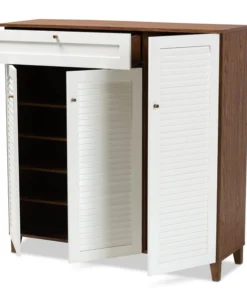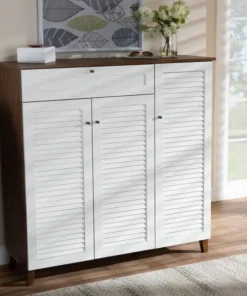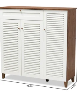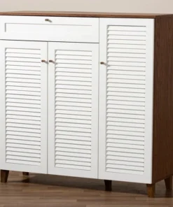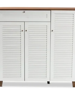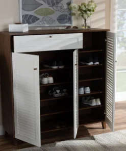 Store your shoes on the sly with the Coolidge shoe cabinet. Three slatted doors, fitted with round knobs, conceal 11 shelves with storage space for up to 21 pairs of shoes. One spacious drawer, accented with inset paneling, provides additional storage space for extra shoelaces and miscellaneous items. Tapered legs add refined style and provide elevation to deter dust buildup. Constructed from engineered wood, the Coolidge showcases a cool white and walnut brown finish that complements any color scheme. The Coolidge shoe cabinet requires assembly.