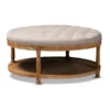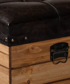 The Edmund storage ottoman solves your storage needs with a rustic yet handy design. Made in China, this ottoman is comprised of a sturdy wood frame featuring an oak brown finish that lends a rustic feel. Its button tufted cushion is padded with plush foam and upholstered in smooth faux leather, creating a cozy footstool or extra seat when needed. Fully assembled, the top of the Edmund opens to reveal ample storage space for extra blankets, pillows, and more. Antique brass finished metal handles and a latch add a vintage touch, making the Edmund ottoman a fantastic addition to any space.