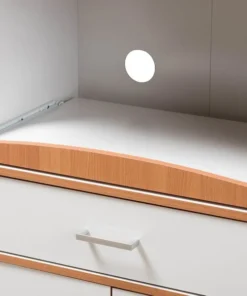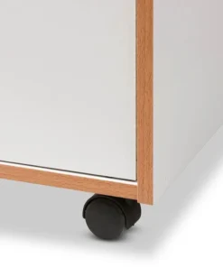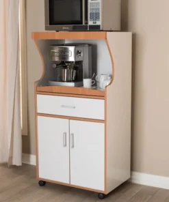 Add both practicality and style to your kitchen or dining room with the Edonia kitchen cabinet. The modern and contemporary-inspired design is clear to see in the rectangular silhouette and subtle grooved features. The Edonia is finished in white with beech brown wood finishing on the edges for a two-tone look. The cabinet features two shelf spaces behind discreet doors, and a drawer on top of them for additional storage. The Edonia's top compartment has ample space for a microwave, with a cut-out in the back panel for wire management. Even more convenient, the space for the microwave is on a pull-out tray, moving smoothly on drawer sliders. The Edonia comes with castors for mobility, so this cabinet can provide storage for utensils and dishware, and can be moved easily for cleaning. The kitchen cabinet requires assembly.