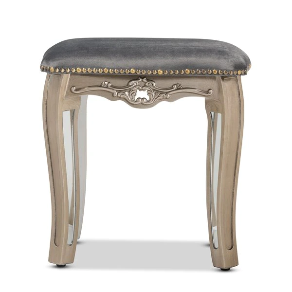 Baxton Studio Elgin Glam and Luxe Grey Velvet Upholstered Brushed Silver Wood and Mirrored Glass Ottoman Stool