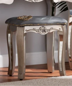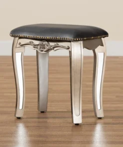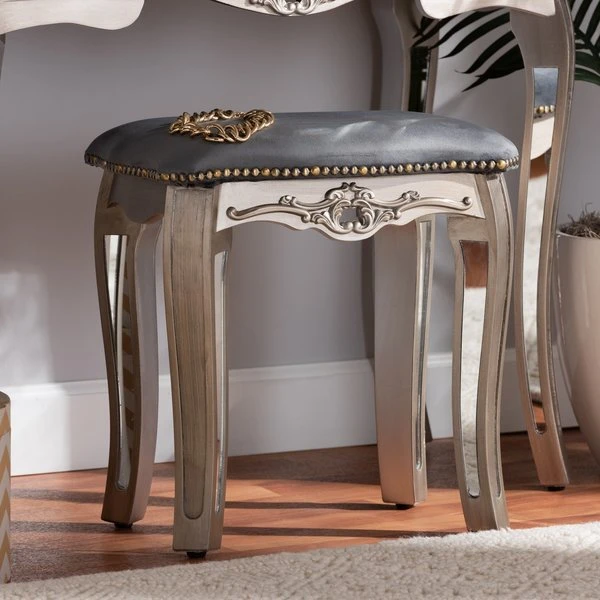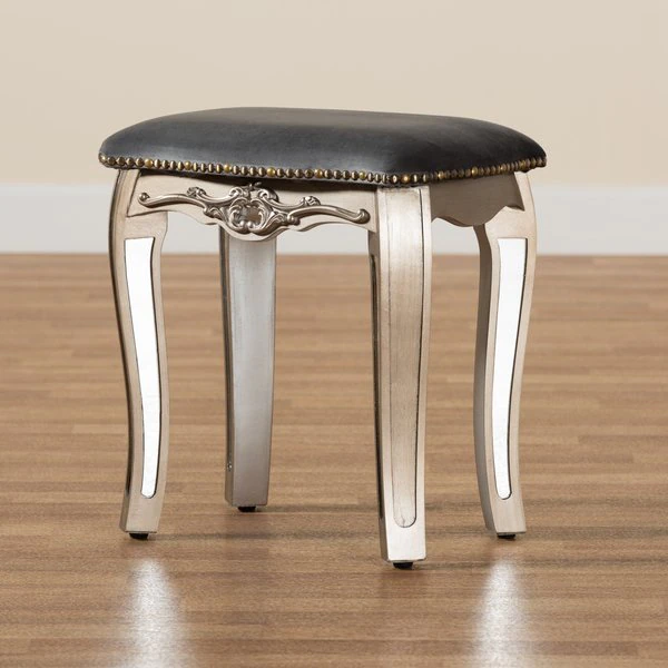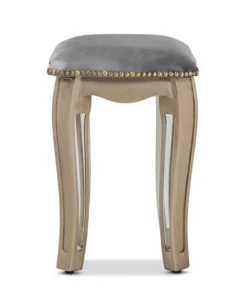 Inject a dazzling accent of modern glamour to your space with the Elgin stool. Made in China, this stool is comprised of a brushed silver finished wood frame topped with plush foam padding and upholstered in smooth velvet fabric. Cabriole legs provide excellent stability, while mirrored glass accents catch and reflect light in dazzling fashion. The Elgin will arrive fully assembled and features an antique brass nailhead trim that outlines the compact stool with a charming allure. Elegant molding further distinguishes the Elgin stool as a lavish complement to any space.