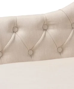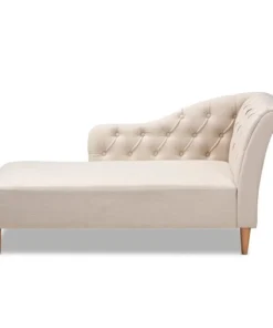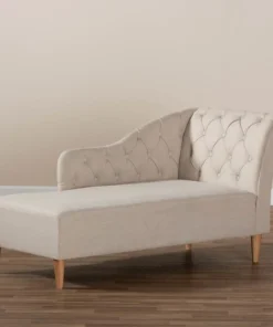 Lounge in style and comfort with the Emeline chaise. This Victorian-inspired chaise features a graceful scroll back and single arm that display lavish button tufting. Designed to add both elegance and function to your space, the Emeline is crafted from sturdy wood and upholstered in a soft, foam filled fabric for the utmost relaxation. The chaise is set on top of tapered, oak finished legs, adding a modern twist to this classic chaise. The Emeline chaise requires assembly.