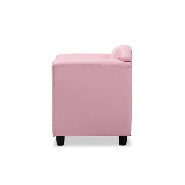Personalize your little one's space with the comfortable and stylish Felice loveseat. Constructed from wood for durability, the Felice Loveseat is upholstered in pink faux leather for luxe appeal. High-density foam padding and armrests ensure a high level of comfort during those Disney movie marathons. The curvy back and flared arms add stylish flair to your little one’s space. This loveseat is sure to become your little one’s favorite spot as they read books, watch TV, and relax with friends. The Felice loveseat requires leg assembly.