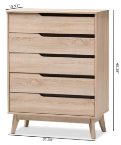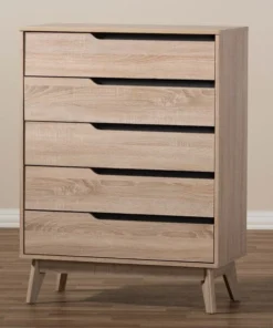 A perfect blend of classic and modernity, the Fella collection showcases pattern played with clever balance of colors and sleek surface. Constructed of engineered wood in oak and grey two-tone finishing, the Fella 5-drawer chest reveals a fresh and relaxing look. Angled legs complements the piece of furniture for superior support and style. Five drawers open to reveal storage room for linen and clothes. With practicality, the inset handles in grey wood finish contrasts with the oak surface for a contemporary, Scandinavian aesthetic in your home. The Fella 5-drawer chest requires assembly.