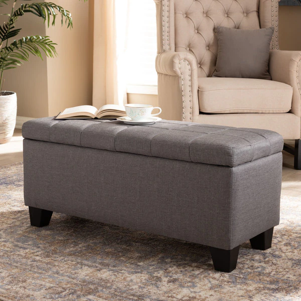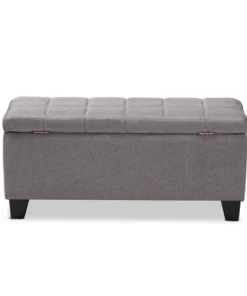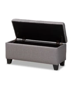 Stylish and versatile, the Fera storage ottoman is a useful addition to any room in the home. This modern ottoman displays a simple, streamlined design that makes it complimentary to a wide range of decor styles. Upholstered in a soft, neutral polyester fabric, the lid is foam-padded and biscuit tufted to provide the utmost sitting comfort. The ottoman features a storage compartment under the lid, providing space to store extra blankets and pillows. Black-finished wood feet complete the look. Use this piece as both seating and storage in the entryway, living room, or bedroom. The Fera storage ottoman requires assembly.