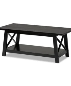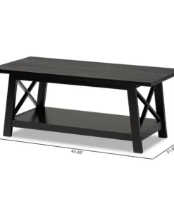 Renovate your living room with the stylish and convenient Germain coffee table. The Germain offers a large amount of surface area, as well as a lower shelf to store books, movies, or decorations. Criss-cross beams on either side of the table allow light to flow through and give the living room a pleasant, open feel. Featuring a black finish that complements its simple aesthetic, this wood table requires assembly. Angled legs give the Germain a sleek look while maximizing its utility.