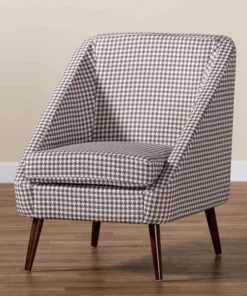 Liven up your living space with the bold sophistication of the Gia accent chair. Featuring long sloping arms and rounded edges, the Gia chair conveys a chic, modern look. Classic brown and white houndstooth fabric upholstery complements the modern silhouette and gives the chair a cool retro vibe. Sturdy walnut brown splayed legs provide solid support. The Gia accent chair requires assembly.