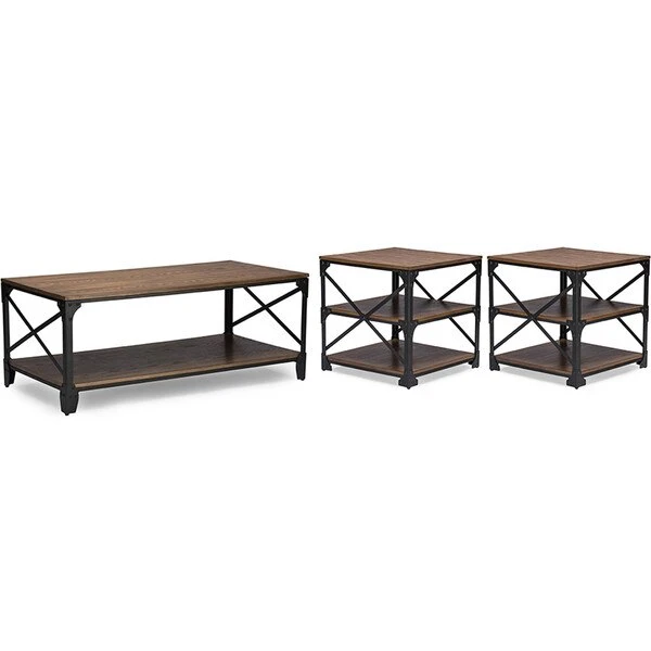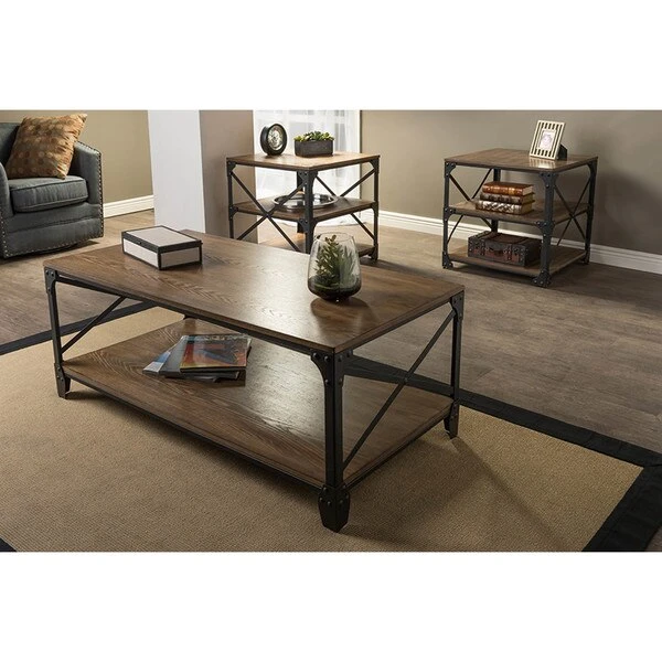 Pairing iron metal frame with distressed finishing wood board, this occasional table set is a striking centerpiece set for your living room. Rustic oak wood grain textured top and the distressed finishing lend a vintage look to the thick table tops. Combined with the metal frame and the classic detailing of industrial furniture, the set is solid and sturdy. A versatile 3-Piece set of living room occasional table set including cocktail table and two end table is perfect for family gatherings or game nights. The tables require assembly.