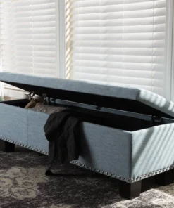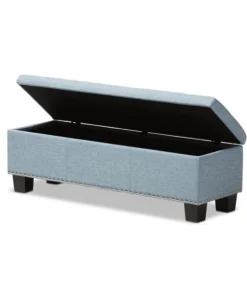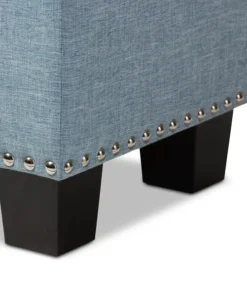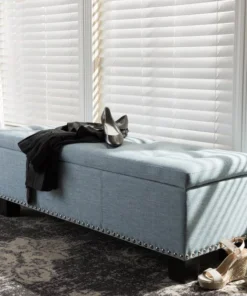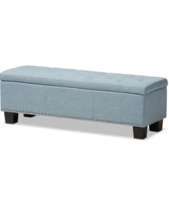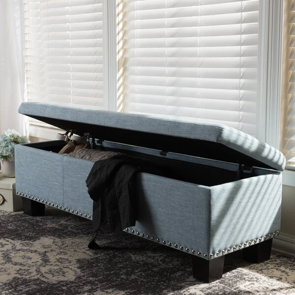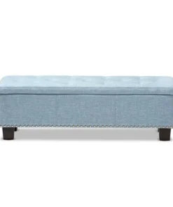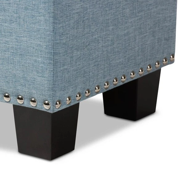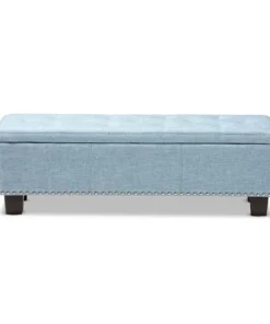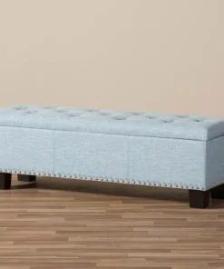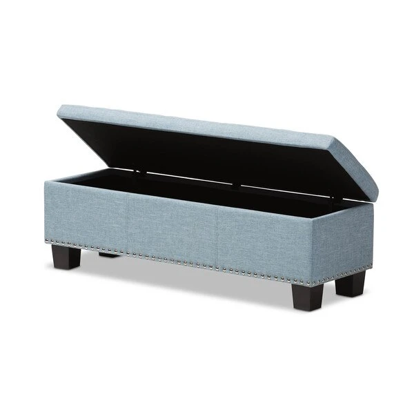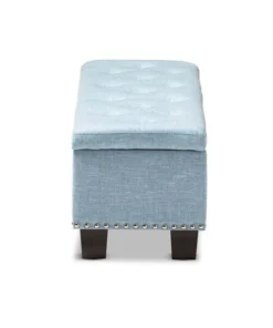 For hidden storage that doubles as additional seating, opt for the modern and contemporary style and comfortable finish of the Hannah storage ottoman bench. Constructed of eco-friendly solid rubberwood frame for sturdiness and durability, the Hannah storage ottoman bench is upholstered in soft polyester blend fabric available in your choice of beige, greyish beige, dark grey or light blue color for a neutral or statement look. The hinged lid includes a cushioned finish for plush comfort, making storage box suitable as extra seating. Beautifully finished with silver nail heads trim, the storage bench features diamond-shaped button-tufting design with deep storage space for added functionality. A versatile piece perfect for storing linens or cushions, the Hannah creates a spot of contemporary style with the benefit of hidden storage. To complete the look, the storage trunk is sitting on four solid rubberwood chunky feet for a strong foundation. The Hannah will be perfect as a bed end bench for your bedroom or as an accent piece in your living space. The storage bench requires minor assembly.