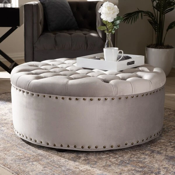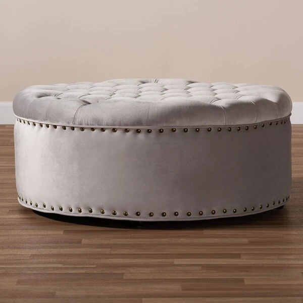 A cut above the rest, the Iglehart ottoman will exceed your expectations. This beautiful living area centerpiece is made with a sturdy eucalyptus wood frame, firm foam cushioning, and velvet fabric upholstery. Finishing touches include antiqued brass upholstery tacks and black wood legs with non-marking feet. The Iglehart ottoman will arrive fully assembled.