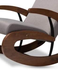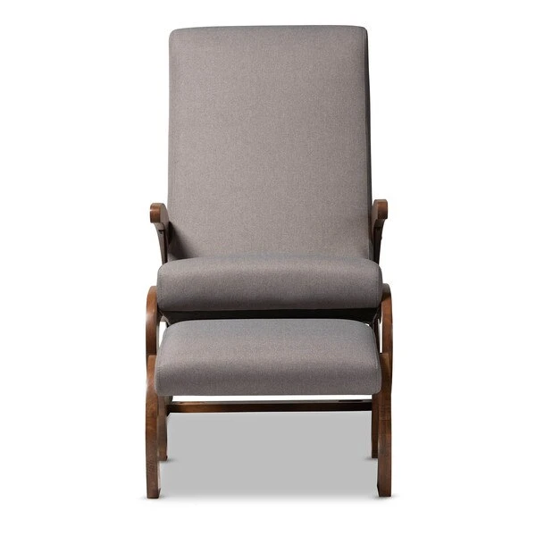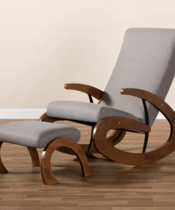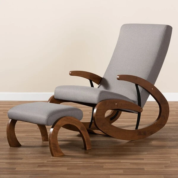 Rock your little one to sleep in style with the Kaira rocking chair and ottoman. Designed with the utmost comfort in mind, this solid rubberwood chair features a tall back and wide seat filled with high-density foam. Large spiral-shaped rockers provide smooth motion and add bold visual interest to your nursery. A rich walnut finish on the rockers are paired with soft, neutral polyester fabric upholstery for easy coordination with any color palette. A matching ottoman completes the look. The Kaira rocking chair requires assembly.