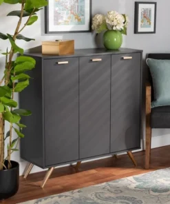 Baxton Studio Kelson Modern and Contemporary Dark Grey and Gold Finished Wood 3-Door Shoe Cabinet