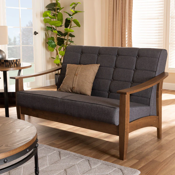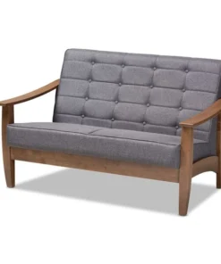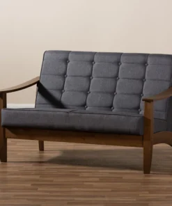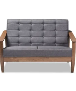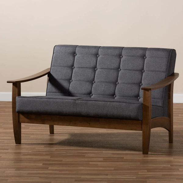 Inspired by chic mid-century Scandinavian design, the Larsen loveseat is a cool addition to any space. Constructed from solid rubberwood, the Larsen showcases a sleek silhouette comprised of sloping arms and an angled back. Wide, plush grey fabric cushions provide comfort and complement the warm walnut brown finish on the frame. Mid-century modern-inspired details, such as biscuit tufting and tapered legs, give the Larsen a vintage charm that recalls of a simpler time. Stylish and versatile, the Larsen is well suited for both private living spaces and public reception areas. The Larsen loveseat requires assembly.