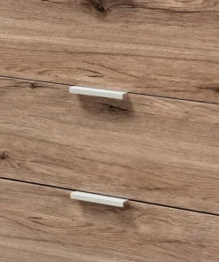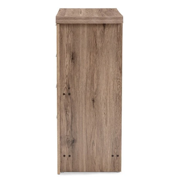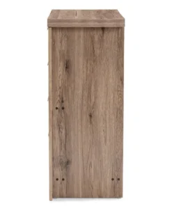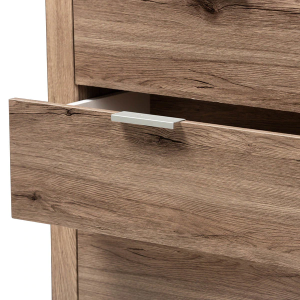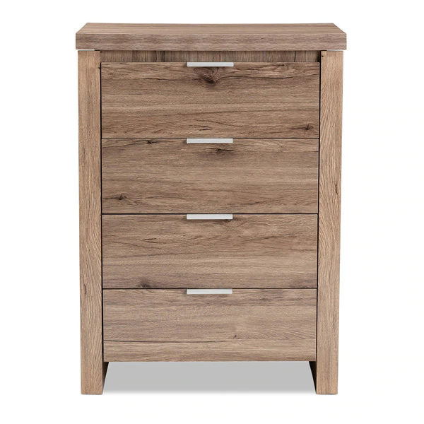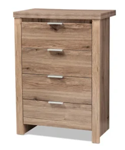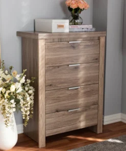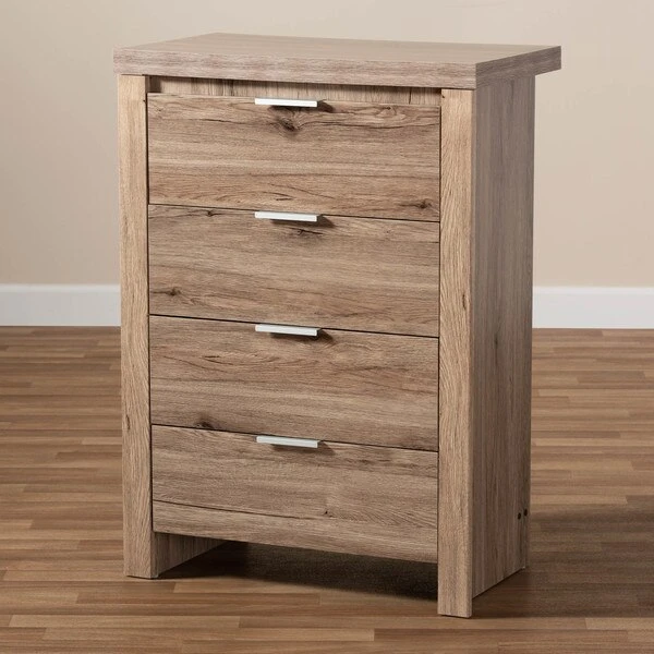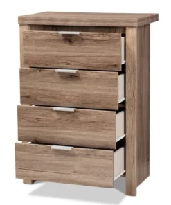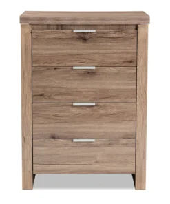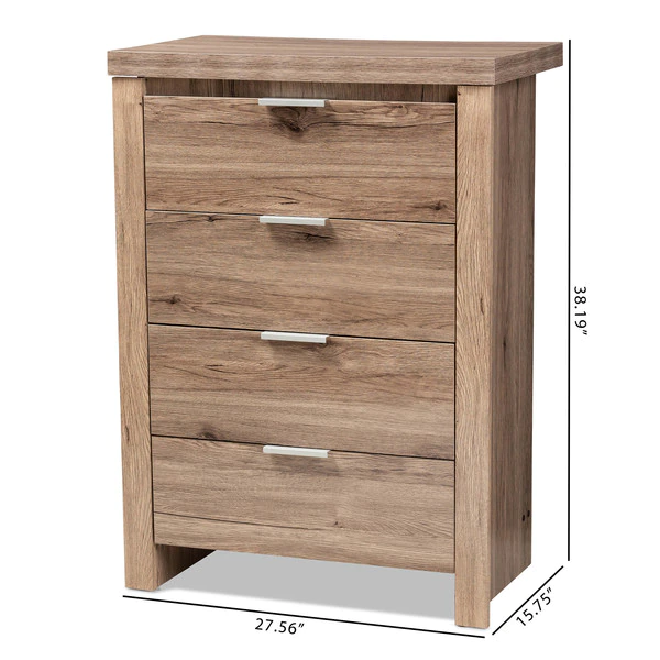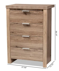 The Laverne 4-drawer chest is an essential piece of furniture that is both charming and simple. The modern and contemporary-inspired design is exemplified in the rectangular, geometric silhouette. The Laverne is finished in a natural oak brown to give you a hint of rustic and natural vibes. The chest features convenient top side drawer pulls on each of the four drawers, which roll out smoothly on slides. The minimalist chest, with its neutral coloring, will be easy to coordinate with the decor in your bedroom or guest room. The Laverne can even serve as additional storage in your entryway, living room, or closet. The chest requires assembly.