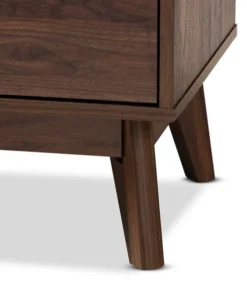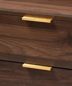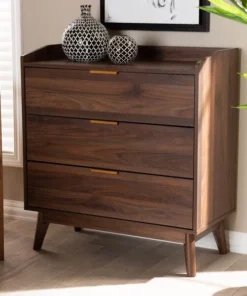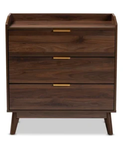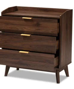 Rich wood tones are paired with a retro silhouette in the Lena chest. Constructed from engineered wood, the Lena displays an elegant walnut brown finish that complements any color scheme. Three drawers present ample space to store clothes, linens, and more. Each drawer is fitted with metal glides for smooth movement, as well as a gold-tone metal handle for a touch of refinement. Angled, tapered legs showcase the iconic mid-century look. The Lena chest requires assembly.