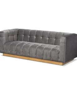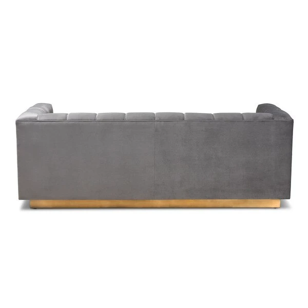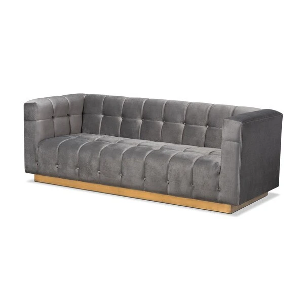 Unwind in luxury with the Loreto sofa. Featuring clean lines, the Loreto is upholstered in a rich velvet fabric that feels exceptionally soft to the touch. Elaborate button tufting is coupled with channel tufting to accentuate the stunning sheen in the velvet and lend lavish appeal. A striking antique gold finished base anchors the glamorous look of this sofa. Equal parts stylish and comfortable, the Loreto is padded with foam for the utmost sitting comfort. The Loreto sofa will arrive fully assembled.