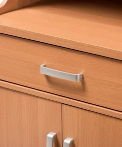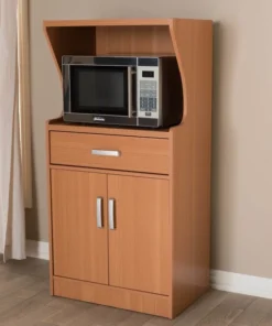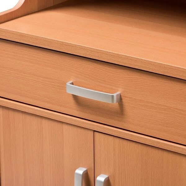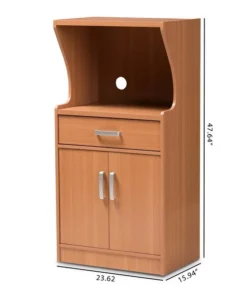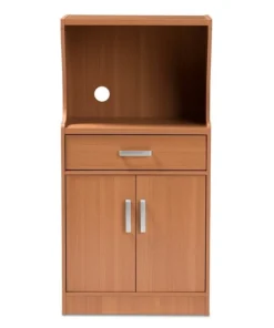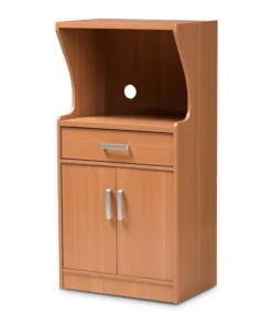 The Lowell kitchen cabinet is the simple, stylish organization solution you've been looking for. The modern and contemporary-inspired design is evident in the rectangular silhouette and subtle grooved features. The Lowell has an all over brown wood finish, with silver-finished door and drawer handles. The cabinet features two shelf spaces behind discreet doors, with a drawer on top of them for additional storage. The Lowell's top compartment has ample space for a microwave, with a cut-out in the back panel for wire management. The Lowell can provide storage for utensils, dishware, cookbooks – or anything else that needs tidying up in your kitchen or dining room. The kitchen cabinet requires assembly.