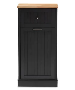 The Marcel kitchen cabinet is the simple solution you've been needing to maximize your kitchen and dining room space. The Marcel's clean, simple coastal and farmhouse-inspired design will add charm to any kitchen and dining area. The oak-finished, thick wooden top offers a convenient prep and serving surface, or a place to keep a microwave or other kitchen appliances. The Marcel features a drawer for storage and a delightfully paneled pull out garbage compartment for even more convenience. The paneled design continues on each side of the cabinet, as well as the face of the drawer. The Marcel's drawer knob and compartment handle are finished in chrome, complementing the colors of the cabinet. The dark grey finished engineered wood frame makes this charming kitchen cabinet a breeze to coordinate with your existing kitchen and dining room decor. The Marcel requires assembly.