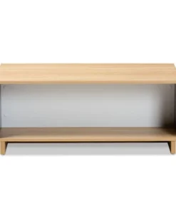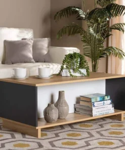 A sleek, contemporary design, the Marigold coffee table modernizes any space. Made in Malaysia, this wooden table features a multi-color finish of oak brown, grey, and white for a cool, modern look. Each side of the table is fitted with a shelf to provide space to display books, magazines, and more. Requiring assembly, the rectangular tabletop provides ample surface area for meals, decorations, and general use. A uniquely modern piece built with versatility in mind, the Marigold coffee table enhances any home.