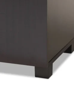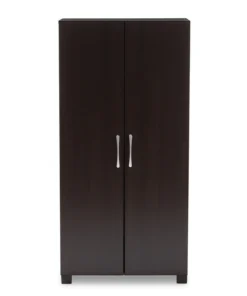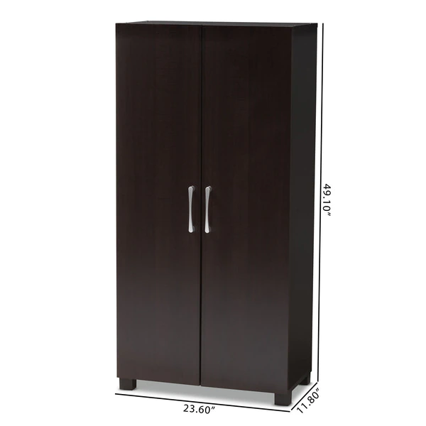 Stylish and compact, the Marine cabinet is the solution to efficient shoe storage. Constructed from engineered wood, the Marine showcases an elegant wenge dark brown finish. Two doors conceal six shelves with storage space for up to 12 pairs of shoes. Circular cut-outs on the back of the cabinet enable air circulation and prevent mold growth on your shoes. Silver PVC door handles and black PVC legs complete the look. The Marine cabinet requires assembly.