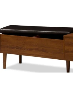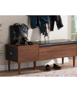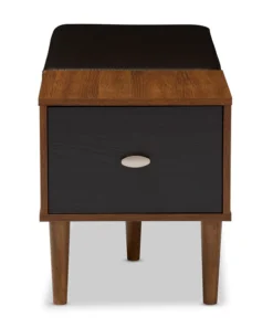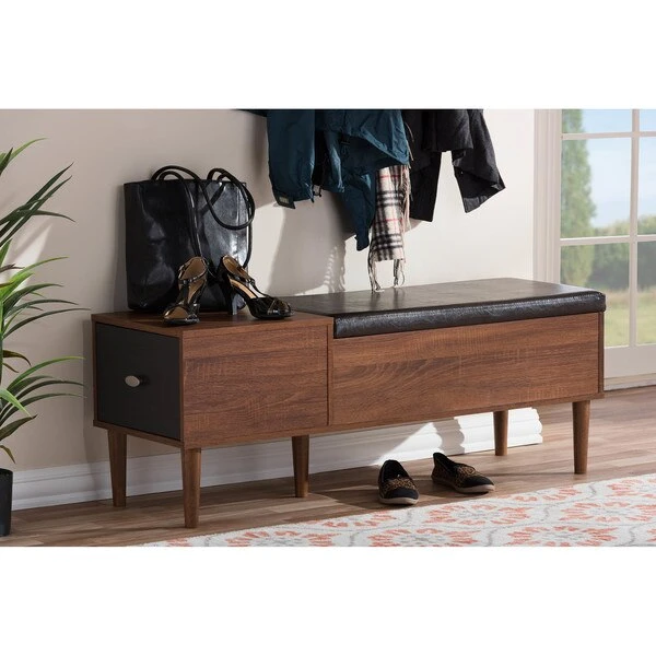 Dual-purposed and versatile, this bench is a great addition to your foyer, mudroom, utility room or bedroom. Featuring retro modern style, the Merrick is constructed of engineered wood and finished in two-tone finishing, oak and espresso brown. The dark brown faux leather cushion provides a comfortable seating area and ample storage space when it is lifted open. The drawer on the right provides extra storage space for your hats, keys, gloves and scarfs. Silver hardware is in use to add modern tone. Shapely legs featuring mid-century style are constructed of solid rubberwood, supporting the seating storage bench. The Merrick requires assembly.