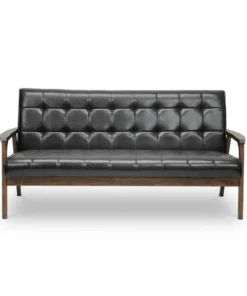 Declare your allegiance to timelessness with our Mid-Century Masterpieces Sofa. Inspired by mid-century style, our modern sofa nods to the past with a foot firmly entrenched in the present. Medium brown wood veneer finish and a brown faux leather foam-cushioned seat seamlessly combine comfort and style.