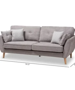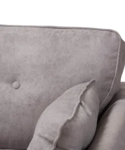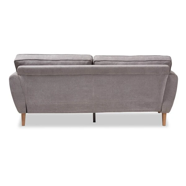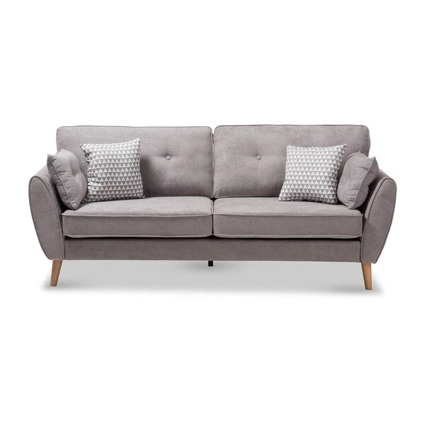 Modern looks never looked so welcoming – sink into the Miranda sofa. The mid-century modern-inspired design is clear to see in the clean lines and low-profile of the sofa. The Miranda is upholstered in light grey fabric and rests on smoothly tapered light brown legs. The sofa features button-tufting on the seat back cushions and delightful piping on almost every visible edge. The Miranda comes with two side pillows and two decorative pillows, and removable cushions for ease of cleaning. It's easy to imagine getting cozy and comfortable on the generously foam-padded Miranda. This sofa will bring extra charm to your living room or other shared space. The Miranda requires assembly.