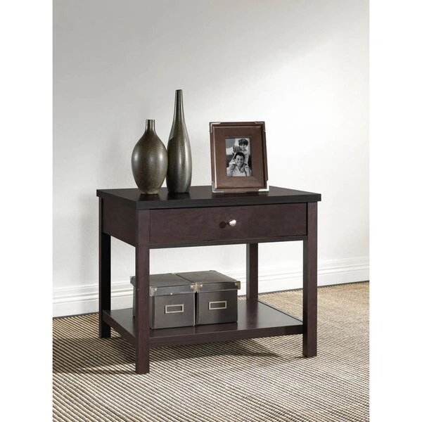 Simple and contemporary, the Nashua Designer End Table offers stylish storage and convenience for your living space or bedroom. Dual-purpose, this modern accent table also makes for an elegant modern bedside table. Features include a drawer on metal gliders with a silver drawer pull and a bottom shelf for decorative items, essentials, and more. Brown faux wood grain paper veneer tops an engineered wood frame, all of which perch atop non-marking feet. This contemporary nightstand requires assembly and should be dusted with a dry cloth. Dimensions: 25.75"Wx22.125"Dx22.25"H, Shelf dimension:24.5"Wx19"Dx12"H, Drawer dimension:19.75"Wx15"Dx2.8"H
