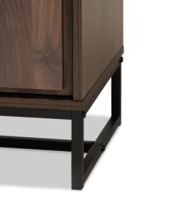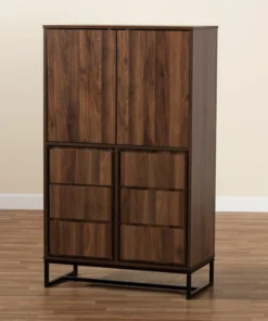 Add spacious storage to any room with the stunning Neil cabinet. Made in Malaysia, the Neil pairs a black finished metal base with walnut brown finished wood for a sleek, modern look. Eight internal shelves, two behind each door, provide ample storage space for clothes, kitchenware, or other various items. Requiring assembly, the lower doors feature raised panels that lend depth and showcase fine craftsmanship. Versatile and contemporary, the Neil cabinet is an excellent addition to the modern home.